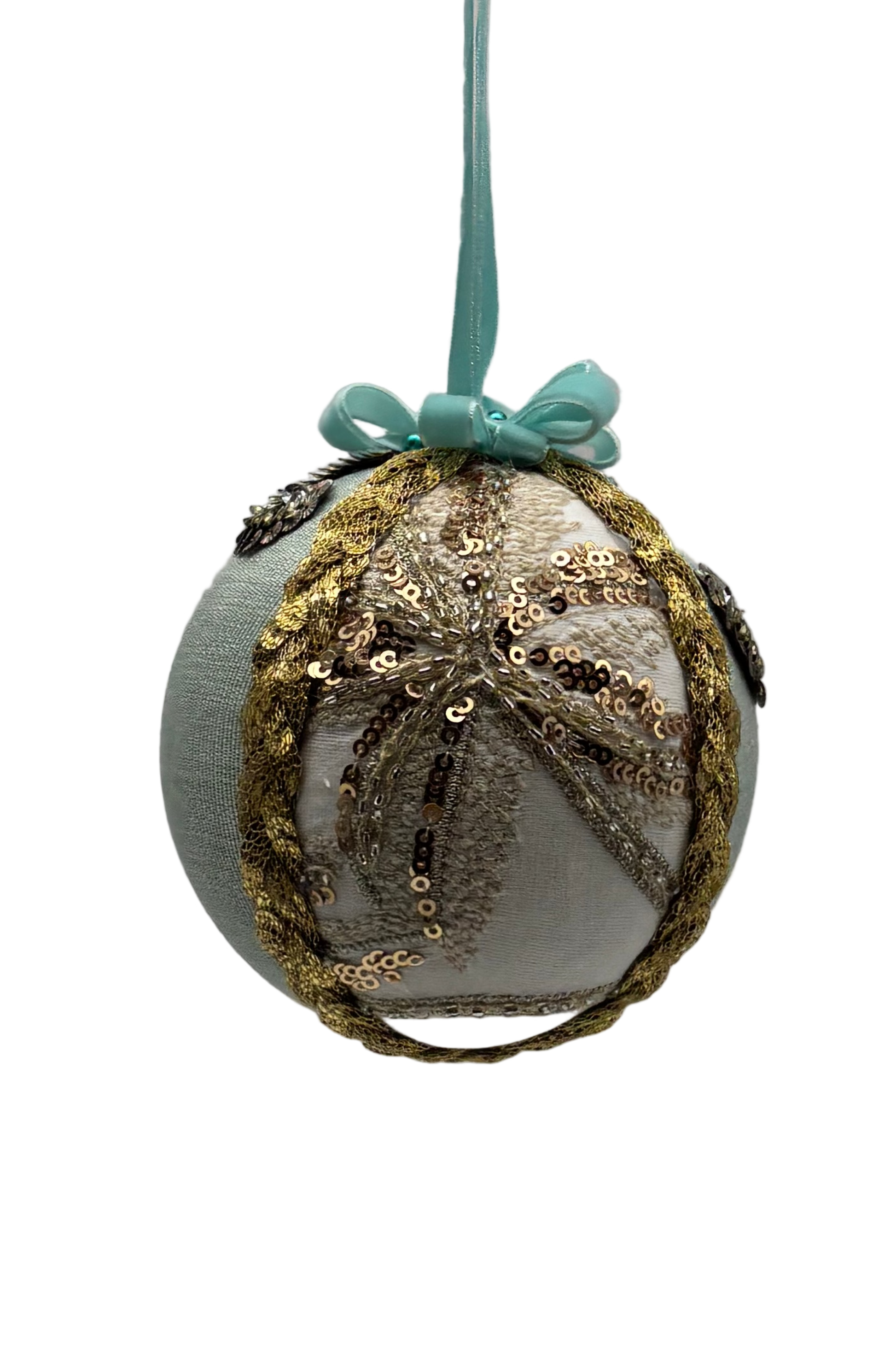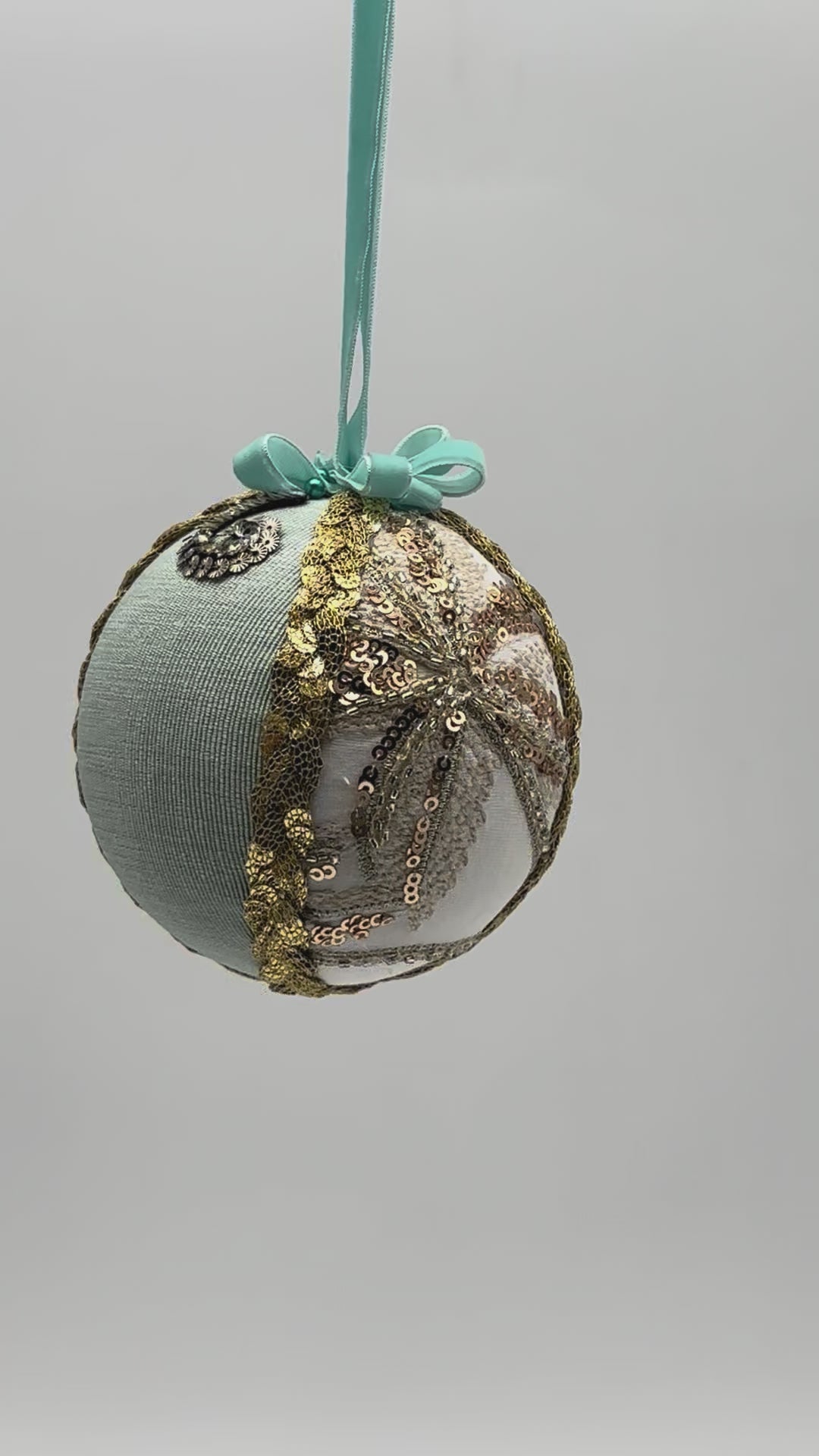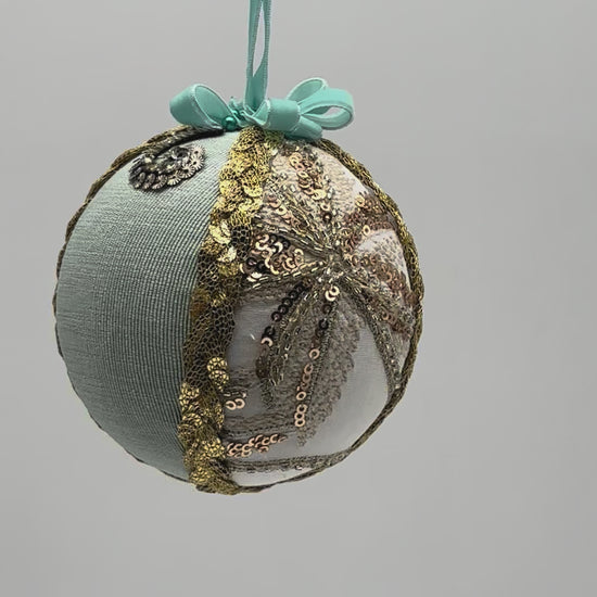 Vêtue d’un tissu vert d’eau délicat, cette boule de Noël unique cache un secret : un palmier doré qui évoque la magie d’un hiver ensoleillé.